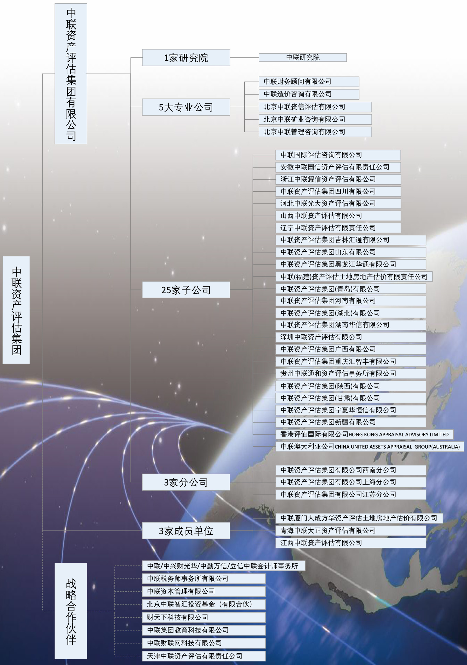中聯(lián)評(píng)估以母子公司法律形式為基本紐帶,由5家專業(yè)子公司、25家區(qū)域子公司、3家分公司和3家成員機(jī)構(gòu)和中聯(lián)研究院構(gòu)建了覆蓋全國(guó)30 多個(gè)省、市和自治區(qū)并向境外延伸的服務(wù)網(wǎng)絡(luò)。