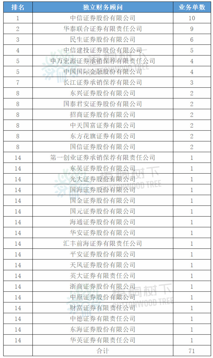 2019年1-9月,共有31家獨立財務顧問機構成功承辦62單并購重組業務。聘請兩家財務顧問的共7家,分別是美的集團、中國中鐵、韋爾股份、聞泰科技、雙匯發展、ST新梅、華峰氨綸。華菱鋼鐵聘請三家財務顧問。故總數為71家。