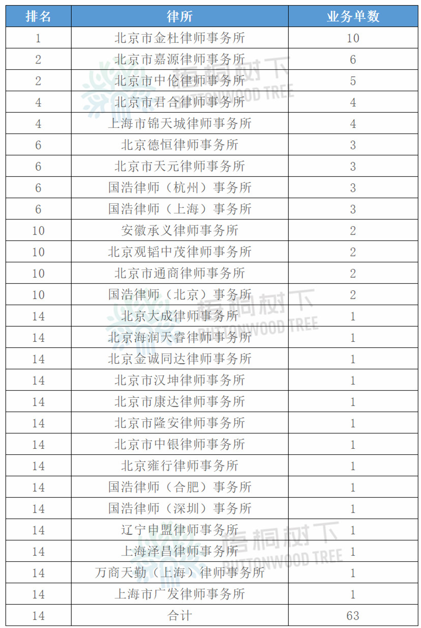 2019年1-9月,共有28家律師事務所成功承辦了62單并購重組項目法律業務。其中,美的集團聘請兩家律師事務所,故總數為63單。