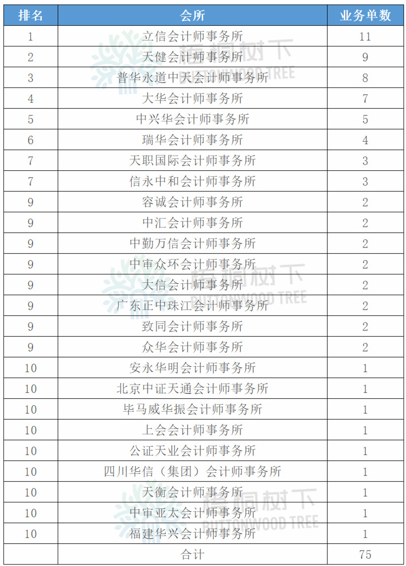 2019年1-9月,共有25家會計師事務所成功承辦了62單并購重組項目的審計業務。其中,13單聘請兩家審計機構,故總數為75單,分別是青松股份、云南旅游、皖能電力、湯臣倍健、中國中鐵、韋爾股份、聞泰科技、福鞍股份、易成新能、ST新梅、長春高新、天業通聯、華峰氨綸。