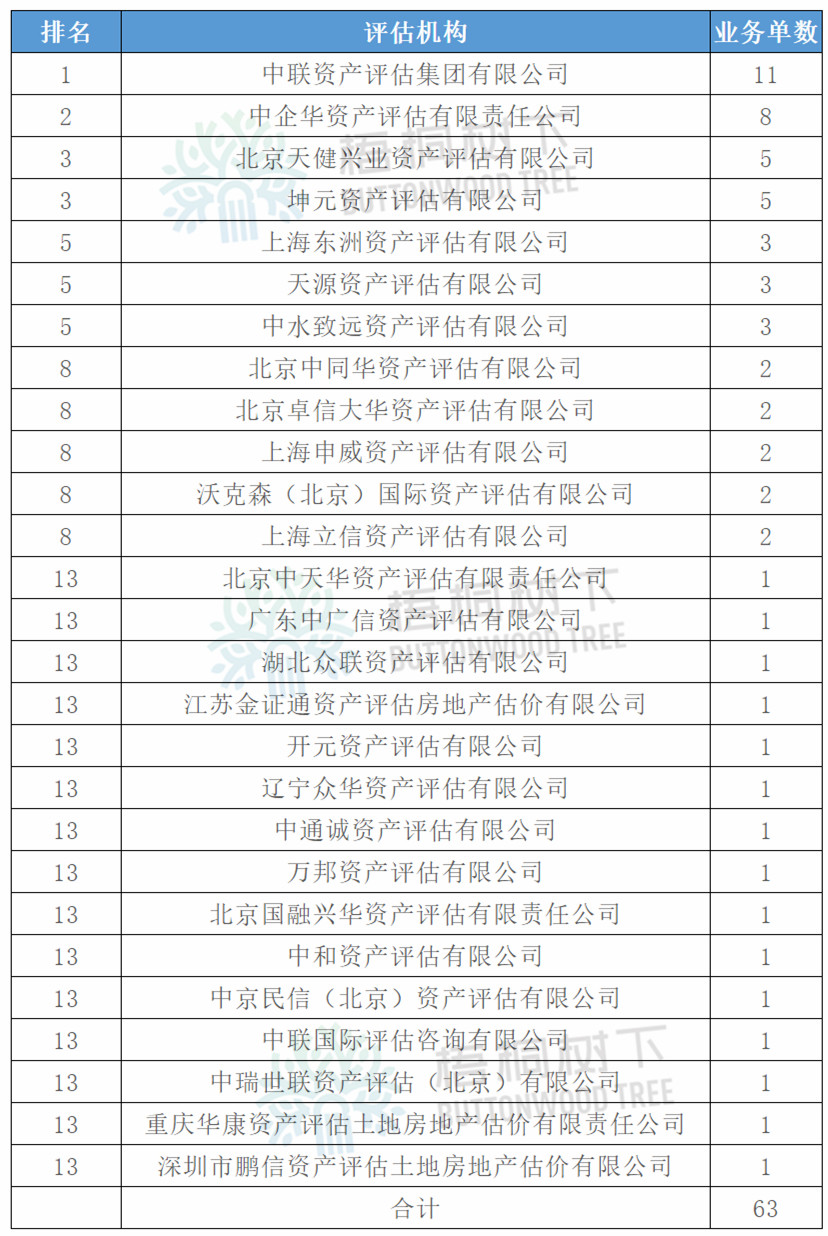 2019年1-9月,共有27家資產評估機構成功承辦62單并購重組項目評估業務。其中,美的集團(000333)吸收合并無錫小天鵝,屬于公開市場合并,由券商出具估值報告,未計入排名。ST新梅、天業通聯聘請了兩家評估機構。故總數為63單。