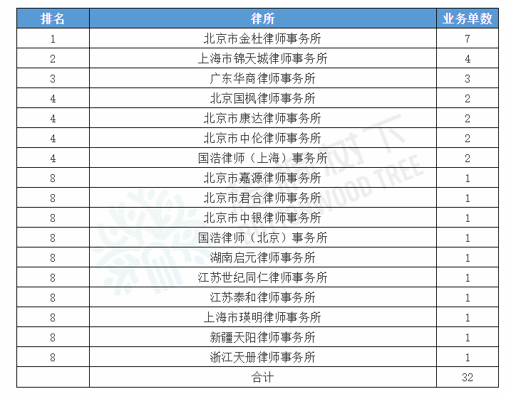 2020年1-6月,共有17家律師事務所成功承辦了32家并購重組項目法律業務。
