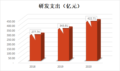 從研發投入來看,2018年-2020年間,研發支出合計共達到277.74億元、343.91億元和422.71億元,研發支出的年復合增長率超過20%。