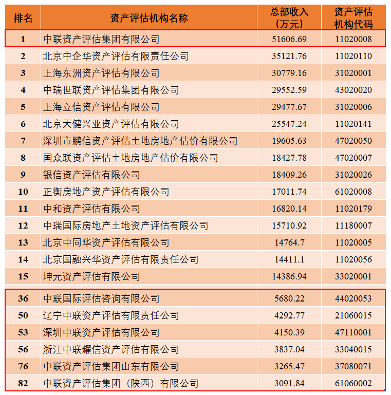 在“2021年評估機構百強榜”中,有6家分子公司亦表現優異,并名列綜合得分和年業務收入百強名單。他們分別是中聯國際評估咨詢有限公司、遼寧中聯資產評估有限責任公司、浙江中聯耀信資產評估有限公司、中聯資產評估集團山東有限公司、中聯資產評估集團(陜西)有限公司、深圳中聯資產評估有限公司。
