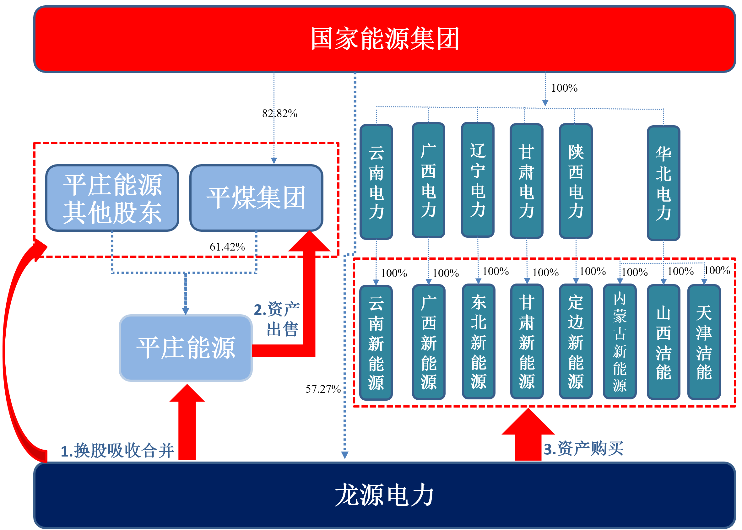 龍源電力通過向平莊能源全體換股股東發行A股股票,換股吸收合并平莊能源。龍源電力作為存續公司,由其或其指定的全資子公司承繼及承接平莊能源擬出售資產外的資產、負債。同時,龍源電力為本次吸收合并發行的A股股票及原內資股將申請在深交所主板上市流通。